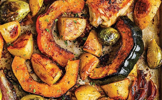 Remove pan from oven, flip the squash over, stir the potatoes and add the brussels to the pan. Roast for an additional 15 minutes or until veggies are tender and the chicken reaches 165 degrees internally. Broil for a couple of minutes before removing from oven.