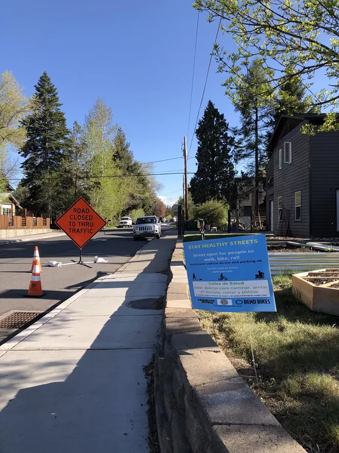 On April 21, the City of Bend began putting in temporary traffic controls to discourage traffic and create pop-up Stay Healthy Streets through already-established or planned Neighborhood Greenways on NE 6th Street and NW 15th Street, as well as "pop up neighborhood greenway routes" on Roosevelt, Centennial, and Hartford in Bend.