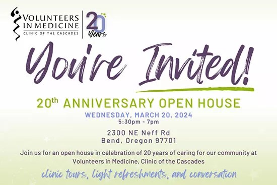 Volunteers in Medicine Clinic of the Cascades (VIM) is celebrating 20 years of providing medical care in its clinic to the uninsured and critically underserved in Central Oregon. Join volunteers, staff, and patients on March 20th from 5:30-7pm at the clinic, 2300 NE Neff Rd on the St. Charles Bend campus. Volunteers will offer clinic tours and visitors will be able to talk with clinic stewards and learn more about the history, and future, of VIM Cascades.