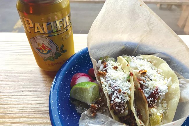 You can’t feast on tacos and beer all day if you don’t start in the morning. And while Bend is rife with breakfast burritos, b-fast tacos aren’t readily found. And when they are, rarely is beer available. Pop into J Dub on weekends to start the crawl off correctly, where the breakfast tacos feature scrambled huevos, bacon, home fries and both pico de gallo and sausage gravy, while the greeny bits on top eschew cilantro in favor of chopped chives. It’s one of the most bombastic, bombest breakfasts in town. Although Boneyard Diablo Rojo sounds the part, opt for Boss Rambler’s Stokes Light, Boss’s stab at a crafty American lager that tastes great and won’t fill you up.