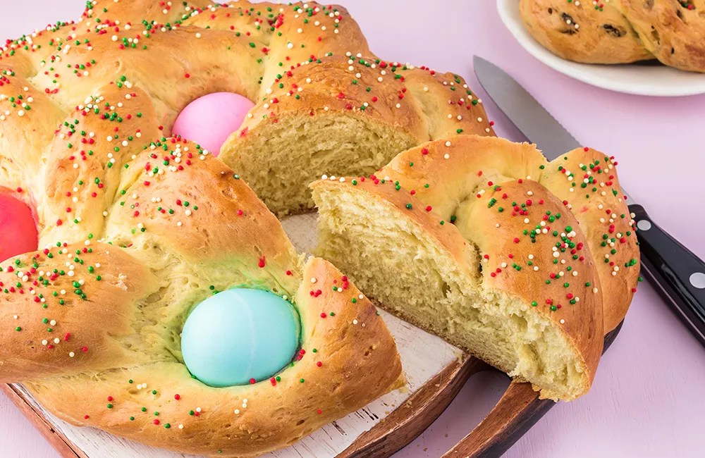 Please note, if youโre not used to working with yeast doughs, itโs very important that the liquid be the correct temperature before mixing it with the yeast. If itโs too hot, it will kill the yeast and the dough wonโt rise. Other than that, just have fun kneading the dough and rolling it into ropes and decorating the bread. Get the whole family involved and Easter bread baking could become a new spring holiday tradition in your home.
