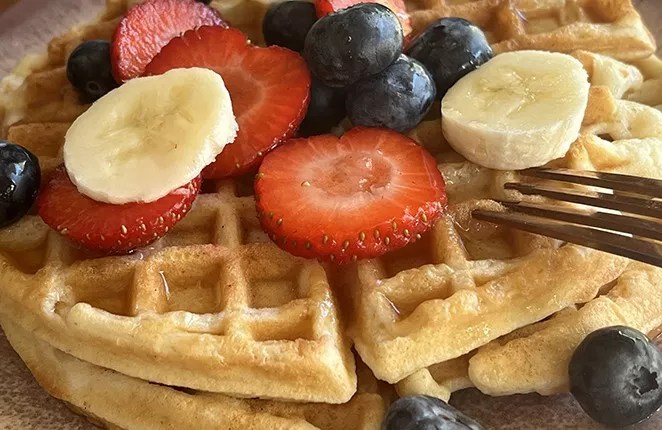 Next morning, stir batter. Sift in baking soda and stir well. Bake waffles in a preheated waffle iron until golden brown.ย Serve with berries, whipped cream, syrup, etc.