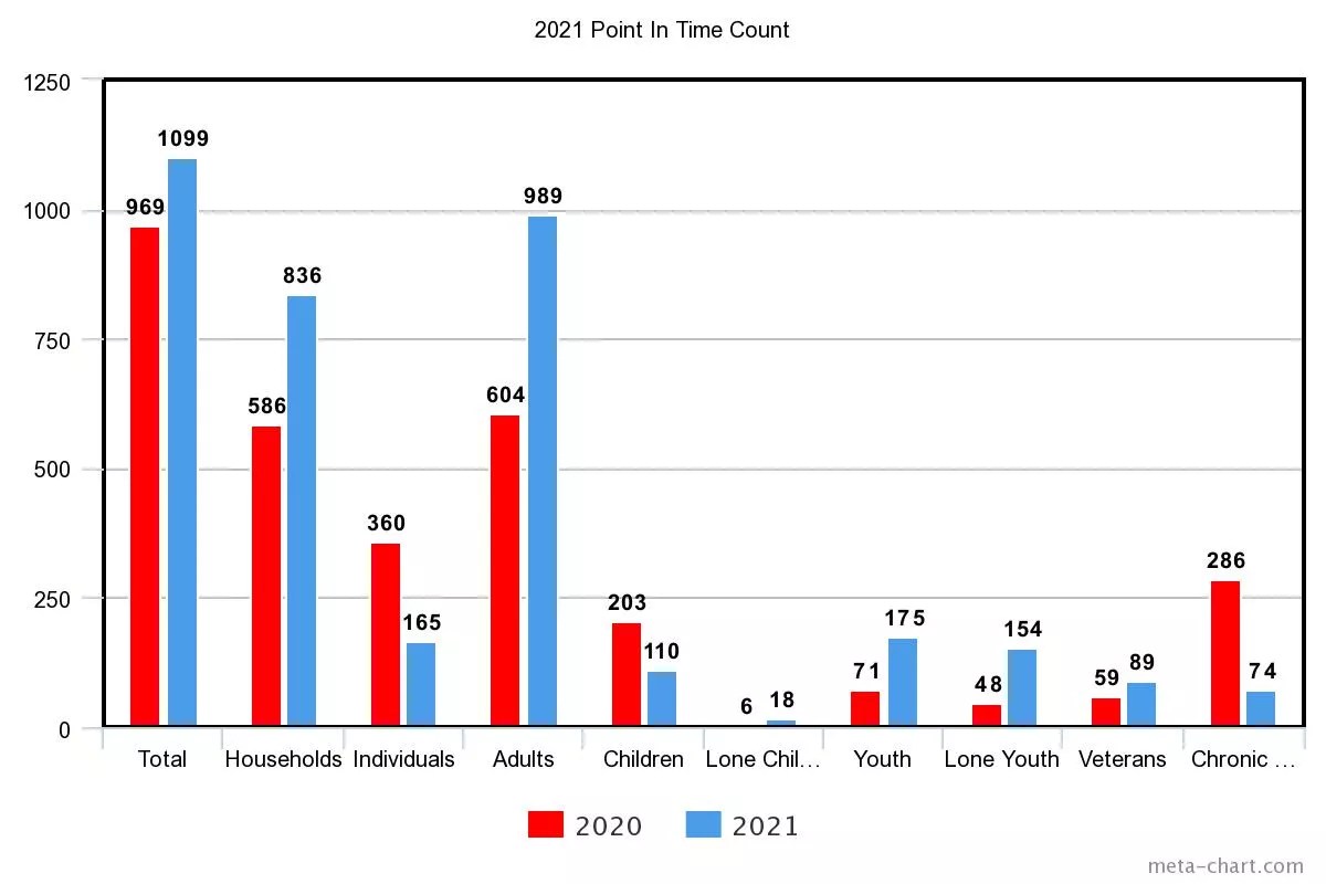 The most recent Point In Time Count shows a 13% increase in the unhoused population, consistent with the last several years. Though the reduction in chronic homelessness is promising, other demographics like youths and unaccompanied children trouble some officials. Credit: Source