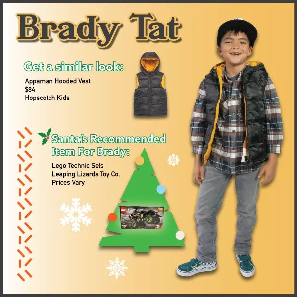 What heโs wearing: Deux Par Deux – Brown/Black Plaid Shirt – $50 Hopscotch Kids, Appaman Hooded Vest – $84 Hopscotch Kids, Pistil Truckers Cap – $38 Powder House Ski and Snowboard.