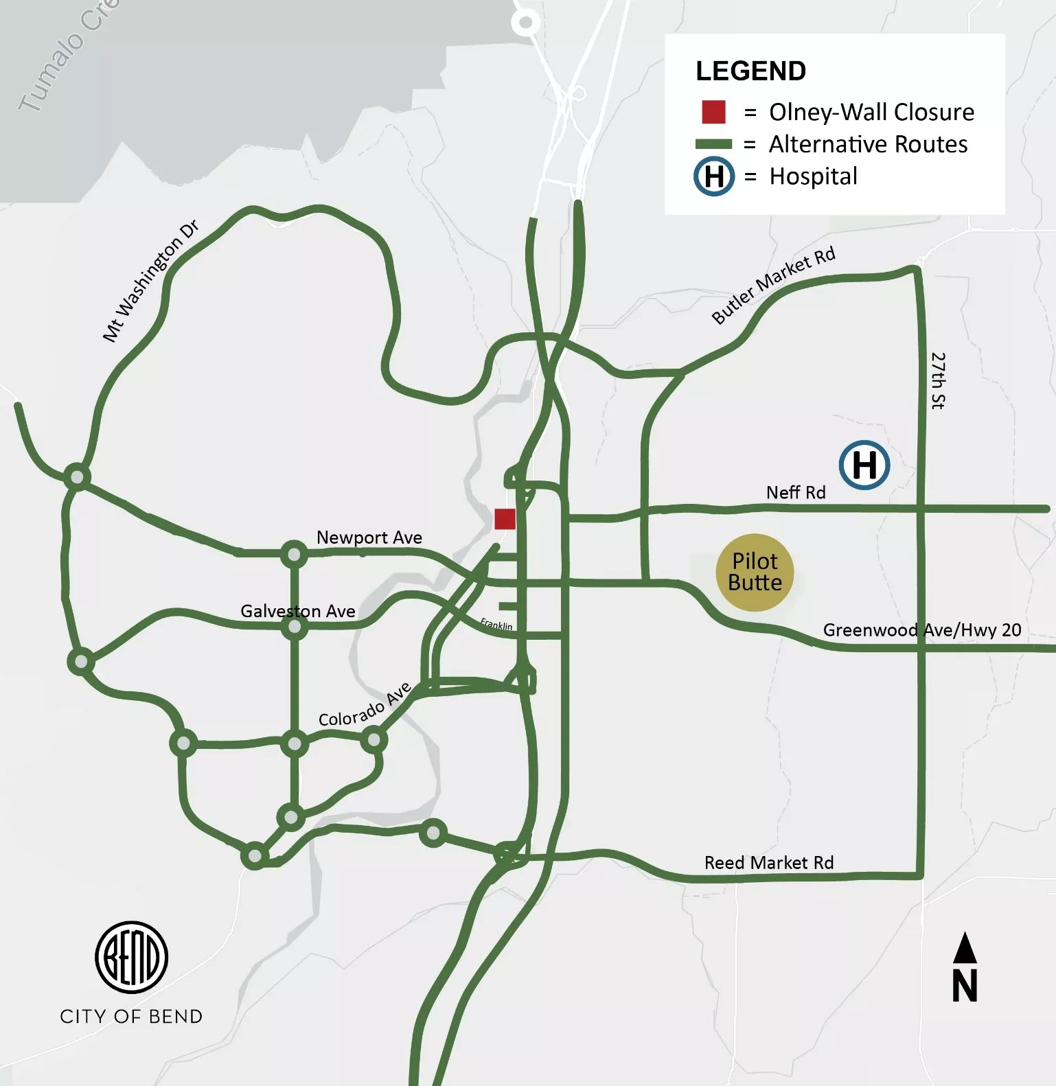 In hopes to improve traffic caused by the Olney Ave. closure, on Wednesday, the City of Bend developed a map to help identify alternate east-west routes that can be utilized to move across town.